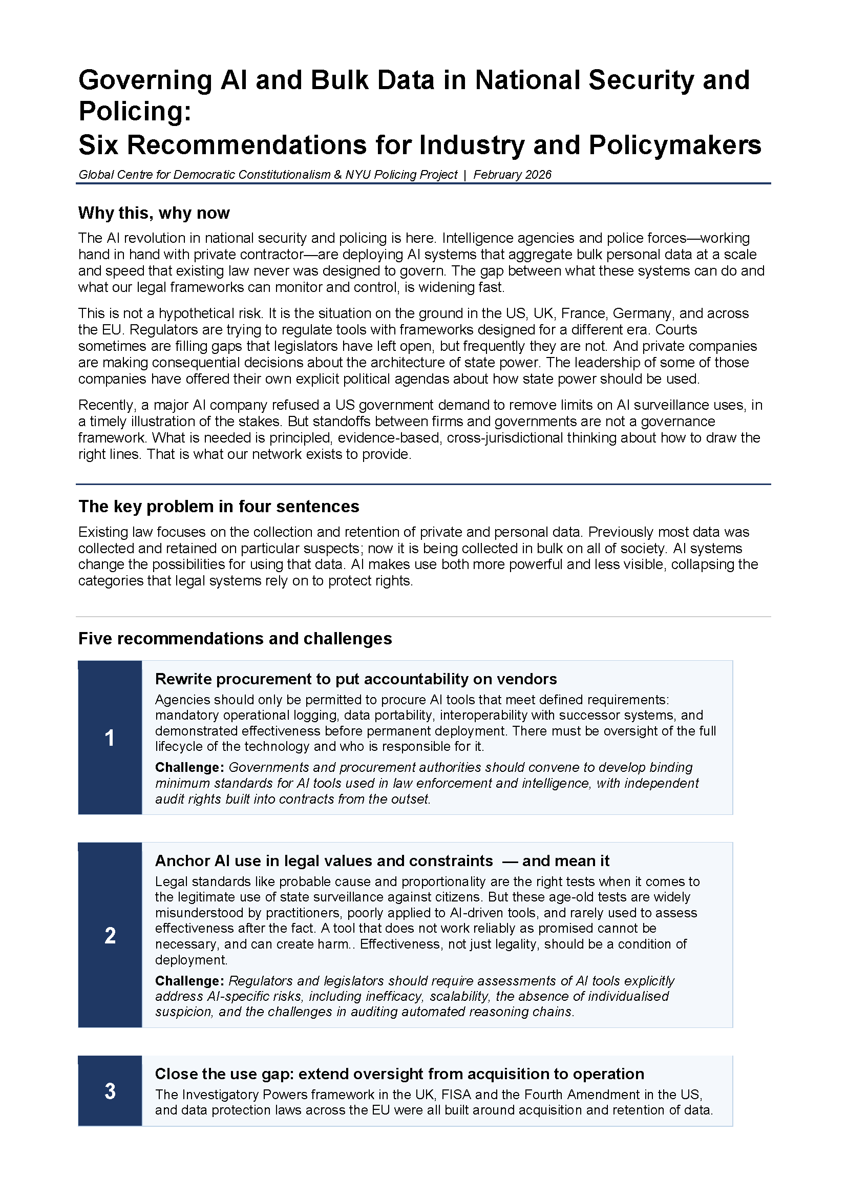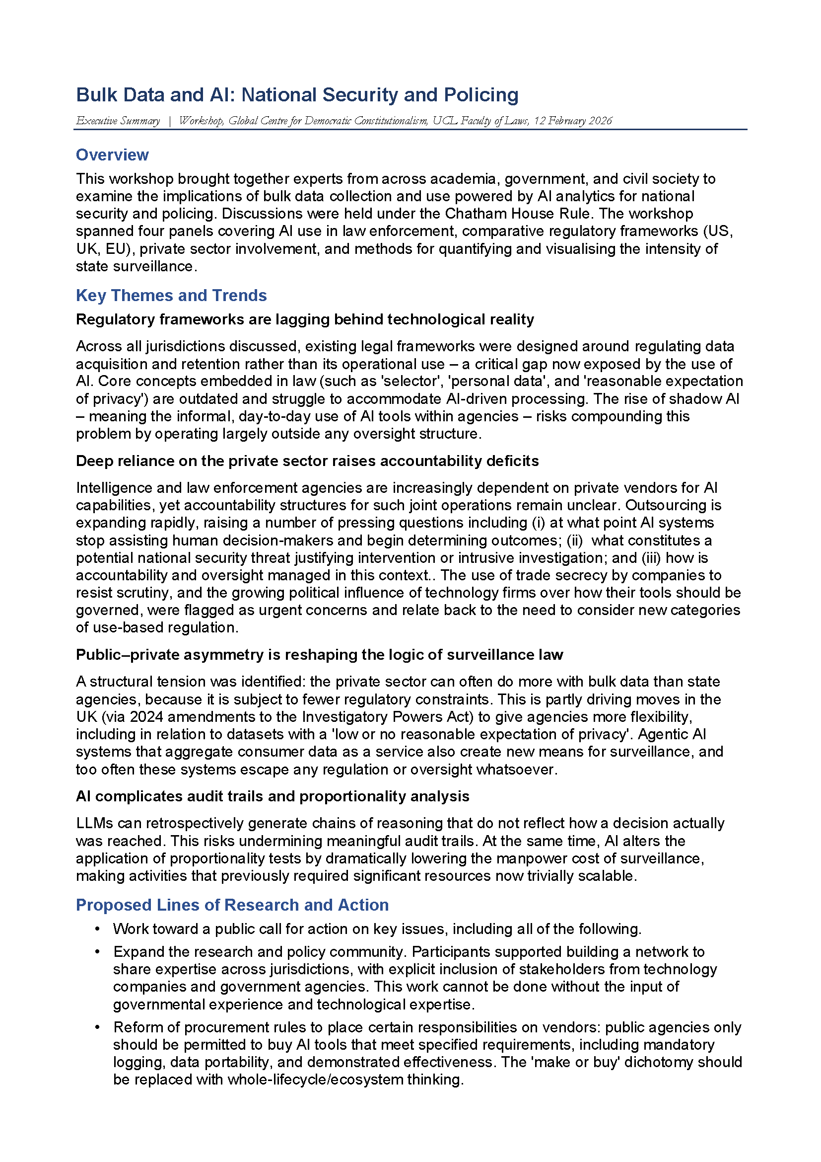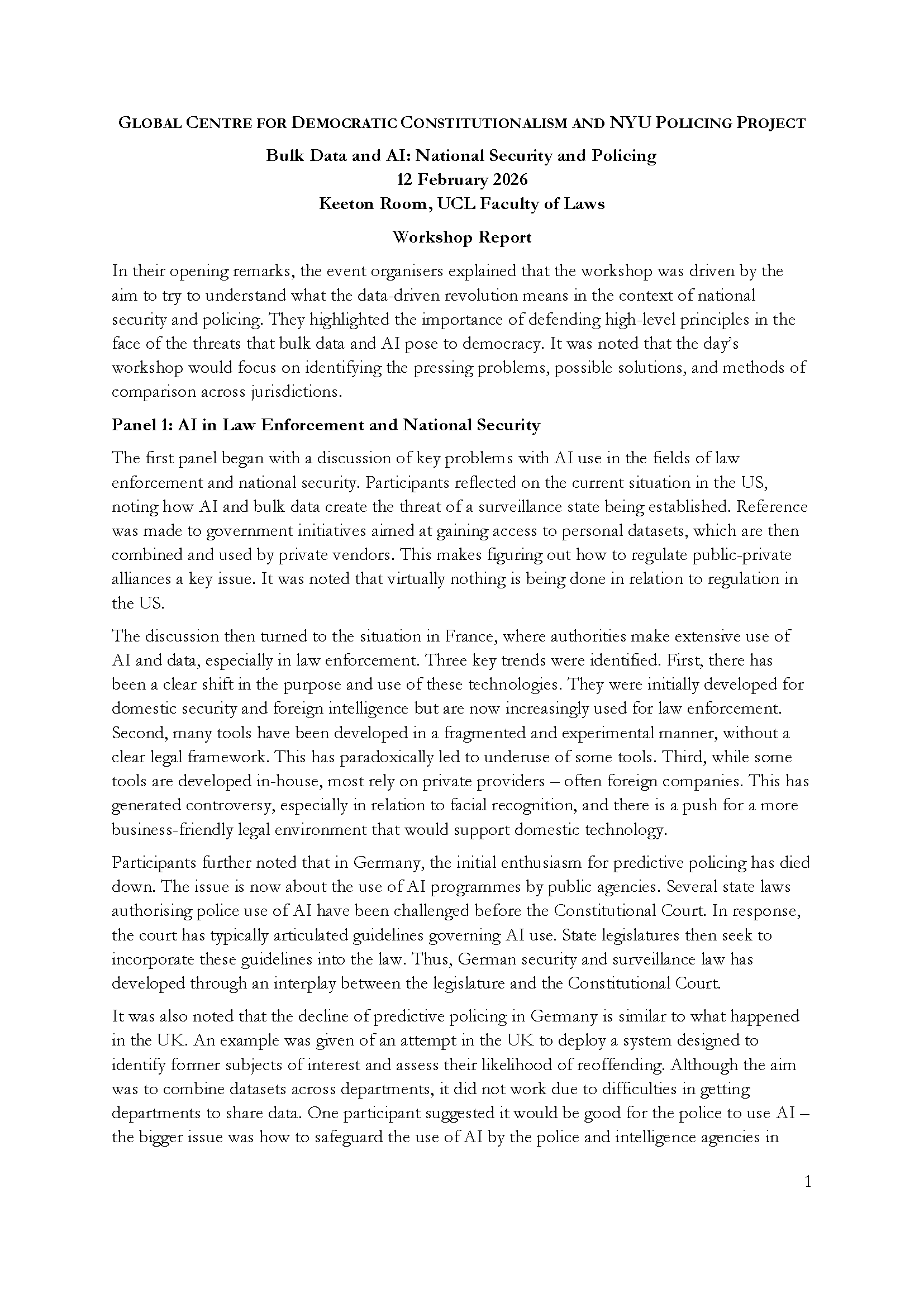 In February 2026, the Policing Project and the Global Centre for Democratic Constitutionalism at the UCL Faculty of Laws co-hosted on artificial intelligence and bulk data collection.